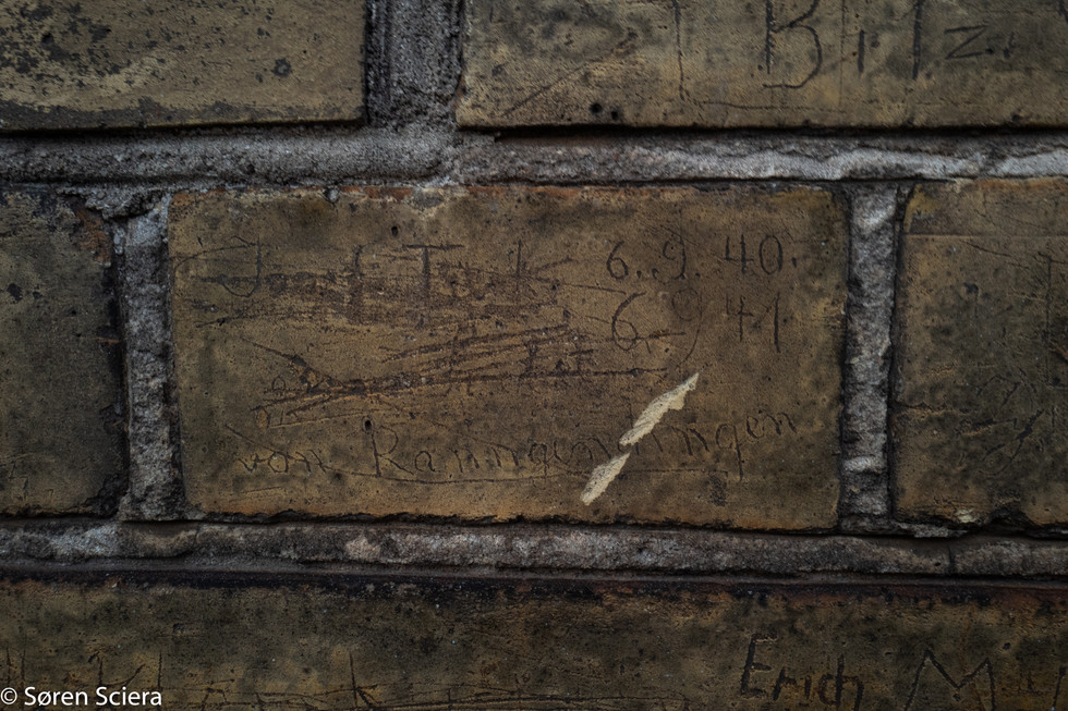Men som de tyske soldater hurtigt skulle finde ud af, var det at vogte kartofler i fredelige København ikke det mest spændende hverv at have. Så i mangel på spænding, og et overmål af kedsomhed begynde de at lave indridsninger i murstenene på Tvillingehallerne, som her mere end 70 år senere stadig er synlige.